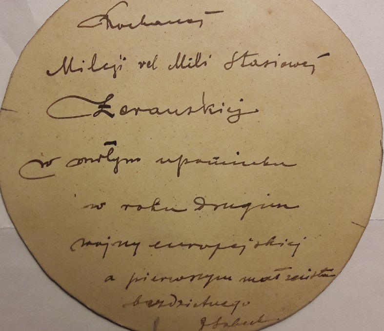 Czytlenik, który kupił tę pracę skorygował opis na podstawie dedykacji na odwrociu. Sportretowaną na miniaturze jest Emilia Żerańska z d. Płachecka, żona Stanisława Emeryka Żerańskiego (1883-1948) . Para pobrała się w 1915 w Warszawie .