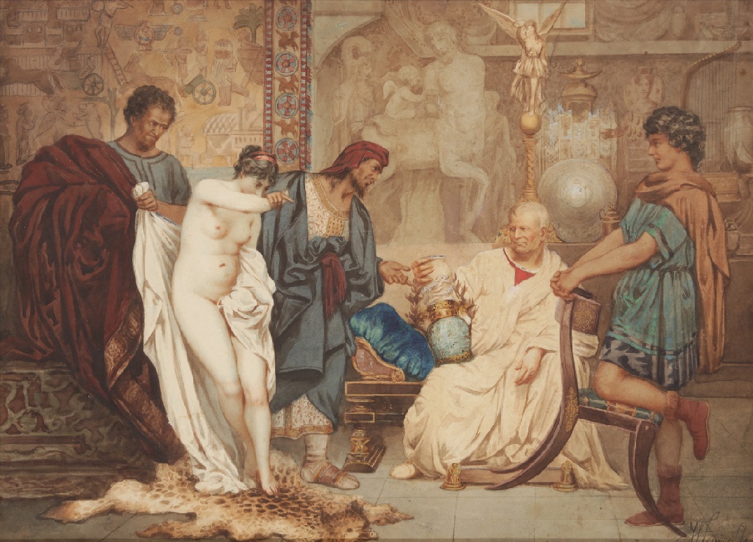 Lot 62. HENRYK SIEMIRADZKI (POLISH 1843-1902). The Girl or the Vase?, signed H Siemiradzki (lower right), watercolour and pencil, 39.2 x 53.4 cm (15 1/2 x 21 in). Executed circa 1874 PROVENANCE: Sale, Bolland & Marotz, Bremen, 21 March 1998, lot 835. Private collection, Europe In 1872 Siemiradzki moved to Rome after winning a scholarship from the St. Petersburg Academy. The artist was capitvated by the ancient city and he became particularly interested in archaeological discoveries and classicsm. The Girl or the Vase? shows a Roman patrician making the difficult choice between acquiring a slave girl or a rare vase. Siemiradzki makes reference to the corrupt power at the height of the Roman Empire and paints exhuberant and exotic objects, displaying his skilled draughtsmanship and ability in conveying splendour. Siemiradzki chooses to focus on lavish excess and dazzling objects, instead of historical accuracy. Towards the upper right of the composition is an imposing marble statue of Eros based on a famed Greek original, but which incorporates elements from several Roman copies. The beautifully painted nude slave’s robes and hair decoration identify her as Greek, despite her standing in a Roman setting. This excess and historical innacuracy within the painting may be viewed as a reference to Rome’s eventual fall. Though The Girl or the Vase? does not depict a particular scene from history, it explores the themes of sex and power. In The Girl or the Vase? the girl’s robe is pulled off her as she struggles to maintain her dignity. She is treated purely as an object to both view and trade. The Girl or the Vase? is a study for a larger final 1878 lost painting, previously in the collection of the Kestner Museum. Another larger version sold at Sotheby’s New York in 2005 for USD 1,426,000. The lost painting earned Siemiradzki the gold medal at the 1878 World’s Fair in Paris and the French Legion Honour. Siemiradzki’s historical paintings propelled him to international fame. He was collected by Tsarina Alexandra Feodorovna ( Empress Consort of Emperor Nicholas II) and received commissions from the Russian Imperial family.