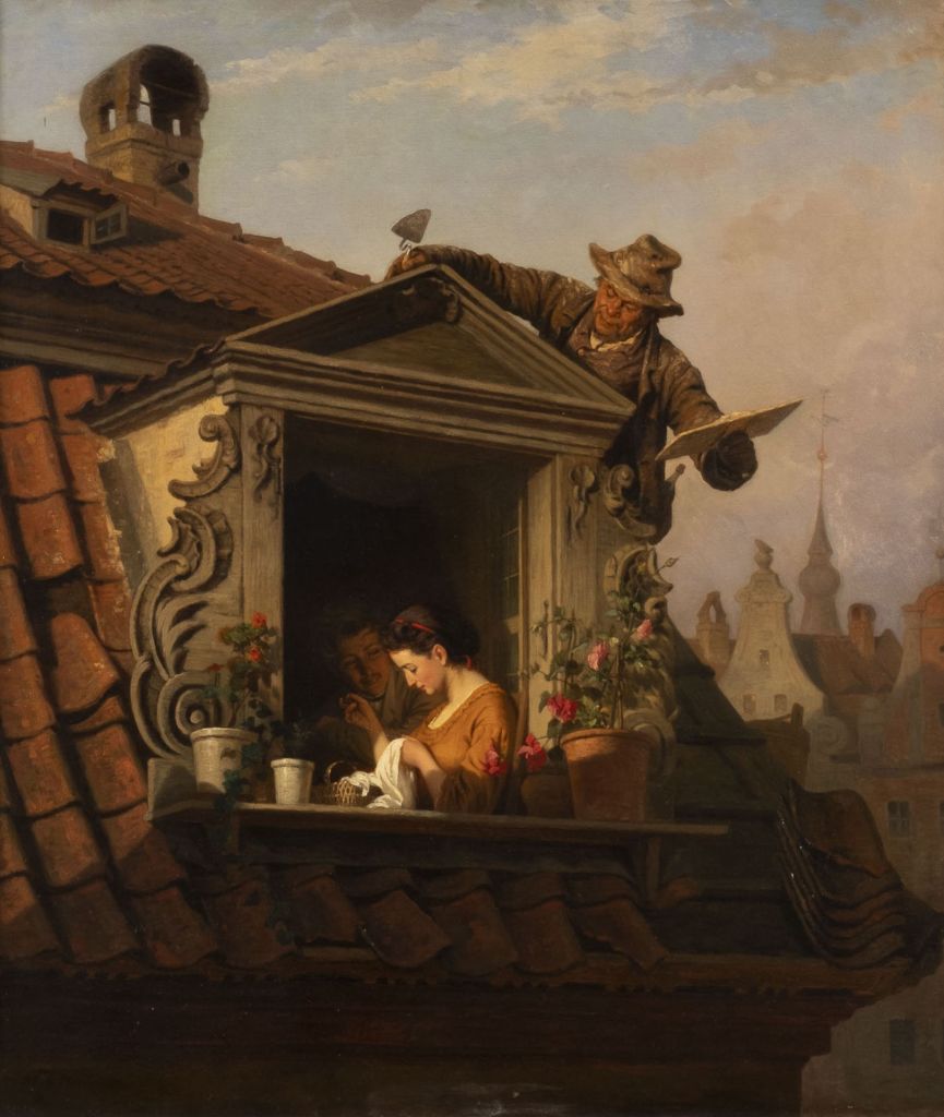 Bardzo rzadko prace Maksymiliana Antoniego Piotrowskiego pojawiają sie rynku. Ta scenka rodzajowa z naprawiaczem dachu podsłuchującym parę rozmawiającającą w mieszkaniu na poddaszu wzbudziła spore zainteresowanie kupujących (bez mojego udziału na blogu) bo cena wyjściowa (2,800 euro) została wielokrotnie pobita w zaciętej licytacji i osiągnęła 22,000 euro. Inna praca tego autora, sprzedana w Niemczech w 2016 roku za 6,800 euro (https://polishartcorner.com/2016/09/02/maksymilian-antoni-piotrowski-1813-1875/), znalazła się już w trzy miesiące później w SopockimDomu Aukcyjnym z wyceną 80,000 – 90,000 PLN i zdaje się spadłą z aukcji (pazerność niewymowna) by wylądować w końcu chyba w muzeum w Bydgoszczy. Jak teraz będzie? Praca sprzed kilku lat artystycznie była dużo lepsza od sporej wymiarami obecnej scenki rodzajowej.