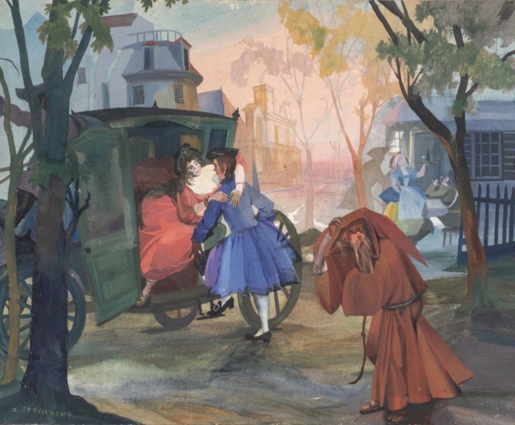 Notre série de cinq gouaches totalement inédites lève le voile sur son premier séjour à Paris, de septembre 1919 à Noël 1920. Installés près du Panthéon, puis rue de Rennes et enfin dans l’atelier de Jan Wacław Zawadowski, les Streyjenski fréquent la bohème de Montparnasse. Marquée par sa rencontre avec la peintre Olga Boznanska, à qui elle consacre un paragraphe entier dans son journal, Zofia Streyjenska rencontre également le violoniste Stefan Frenkel, les comtes de Tubieński et Rzewusk, les sculpteurs Jadwiga Bohdanowicz-Konczewska ou Artur Rubinstein. Le couple explose dans la capitale française, conduisant à une première rupture, Zofia continue, elle, de créer, bien qu’il reste peu de témoignage de cette époque. Elle a en effet déchiré ses dessins rapportés en Pologne, où seule une poignée de tableaux de cette période cubiste est conservée.