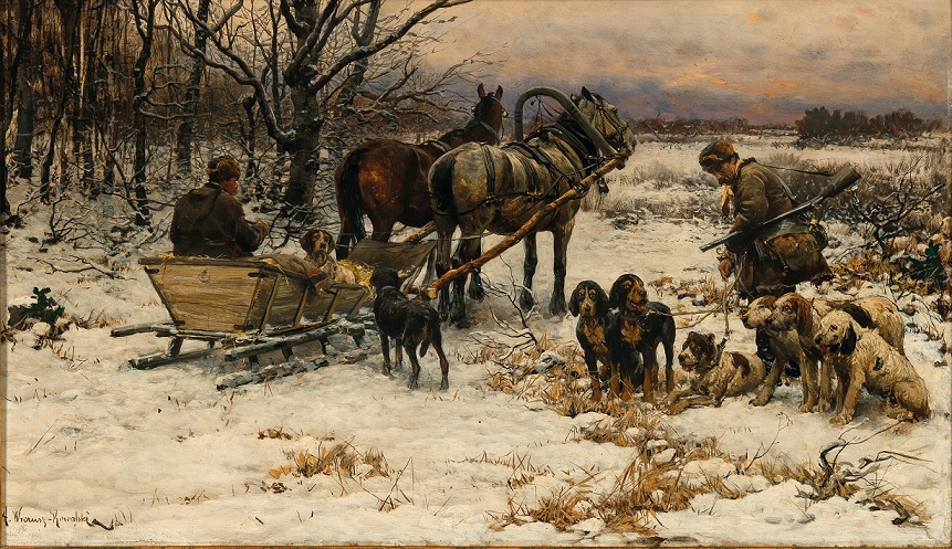Lot 602. Alfred von Wierusz-Kowalski (Suwalki 1849–1915 Munich). Off to the Winter Hunt, signed A. Wierusz-Kowalski, oil on panel, 32 x 55 cm, framed, Provenance: Private Collection, Germany. Estimate 25,000 – 35,000 euro. Dorotheum. 05/10/22. Sold 130,000 euro