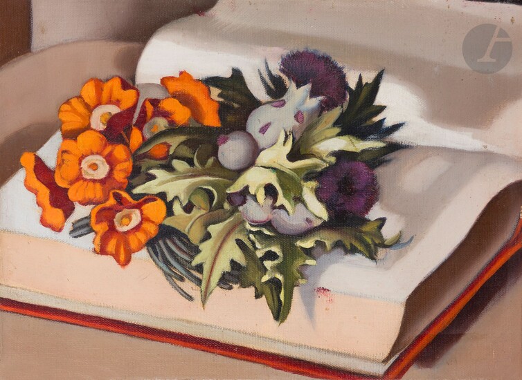 Lot 40. Tamara de LEMPICKA (1898-1980). Bouquet de chardons au livre ouvert, vers 1927. Huile sur toile. Non signée. 16 x 22 cm. Provenance : Collection particulière, Paris 7e. Bibliographie : Alain Blondel, Tamara de Lempicka : Catalogue raisonné, 1921-1979, Lausanne, Éditions Acatos, 1999, n° B.92, reproduit p. 169. Un certificat de Madame Kizette de Lempicka Foxhall, fille de l’artiste, en date du 3 avril 1989 sera remis à l’acquéreur. Estimate 25,000 – 30,000 euro. Ader. 05/13/22