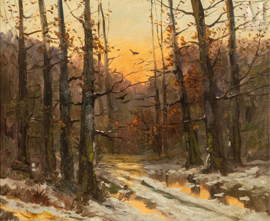 Lot 51. Stanislas Yulianovich JOUKOVSKY (1873-1944). Forêt enneigée au crépuscule. Huile sur toile, signée en bas à droite en russe. Dans un beau cadre en bois doré avec cartouche. H. 46,5 x L. 55 cm. Provenance: Collection privée française depuis les années 1980. Estimate 20,000 – 30,000 euro. Millon. 05/31/22