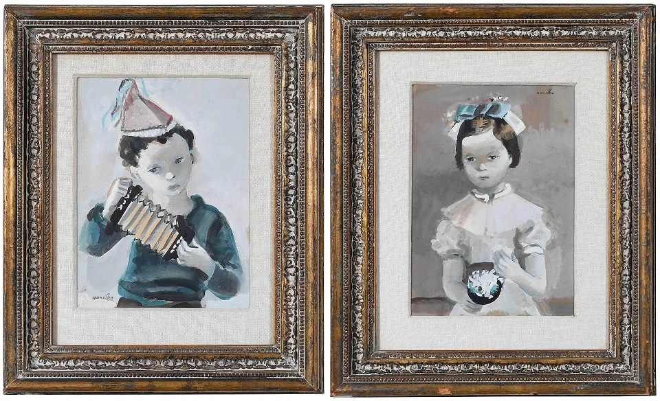 Lot 860. A Pair of Rajmund Kanelba Figural Paintings (Polish, 1897-1960). Young Girl with Posey, signed upper right ?kanelba?, gouache on brown card, sight, 10-5/8 x 7-1/2 in.; original gilt and painted wood frame, 17-7/8 x 15 in.; Young Boy with Accordion, signed lower left, “kanelba”, gouache on brown card, sight, 10 x 7-1/2 in.; original gilt and painted wood frame, 17 x 13-7/8 in. Provenance: Findlay Galleries (label verso one); Property from a Private South Carolina Plantation. Estimate $2,000 – 4,000. Brunk. 05/21/22. Sold $2,800