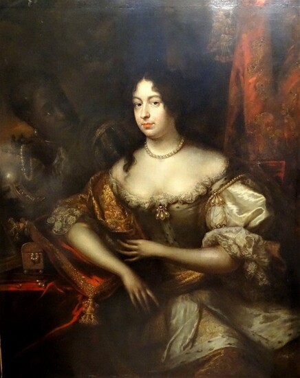 The psychological capture of deep character in the look, the point of view represented in the scene, the sumptuousness in the details of the clothes and objects, and the use of the colours between lights and shadows allow us to place the author of this work in an environment close to the school of the great French painter Hyacinthe Rigaud (1659-1743), one of the best portrait painters associated to the era of Louis XIV. He made an outstanding contribution to French painting from 1688 onwards. He was particularly noted for his portrait art, depicting members of the French royal family. Notable, for example, is his famous state portrait of “Louis XIV at Coronation Robes” (1701, Louvre, Paris), one of the finest Baroque paintings of the French court. Rigaud’s broad, vigorous style and the way he relied on the nobility of posture and splendour of his models were the basis of his success. Indeed, he is the creator of an original genre, that of the “portrait of pomp” which spread through the European courts of the first half of the 18th century. Examples of his great output can be seen in some of the finest art museums in Europe and North America. For details of other famous artists and master craftsmen active in France during his day, see: French Baroque Artists (c.1600-1700) and French Decorative Designers (c.1640-1792). The pictorial quality of the work is superb. It shows great mastery of the portrait genre. It is thought to have been executed in Rigaud’s own workshop, which, due to the multitude of royal and noble commissions at the time, had a large number of artists in its employ who worked on the completion of these portraits. Marie-Casimira Louise De La Grange was known by the nickname of “Marysie?ka”. She was born in Nevers (centre of France) on 28 June 1641 and died in Blois (France) on 1 January 1716.) She was Queen consort of Poland and Grand Duchess consort of Lithuania as the wife of John III of Poland from 1674 to 1696. She was the daughter of Henri Albert De La Grange d’arquien and Françoise de La Châtre.