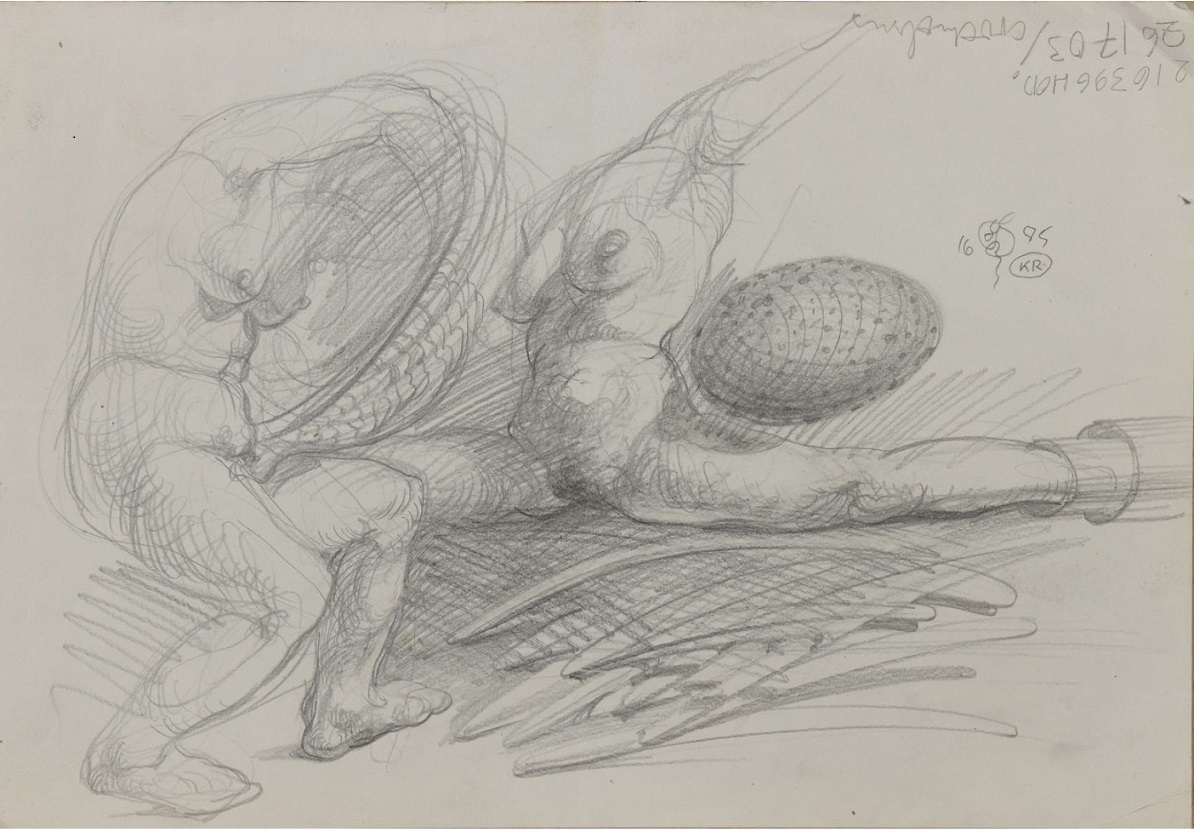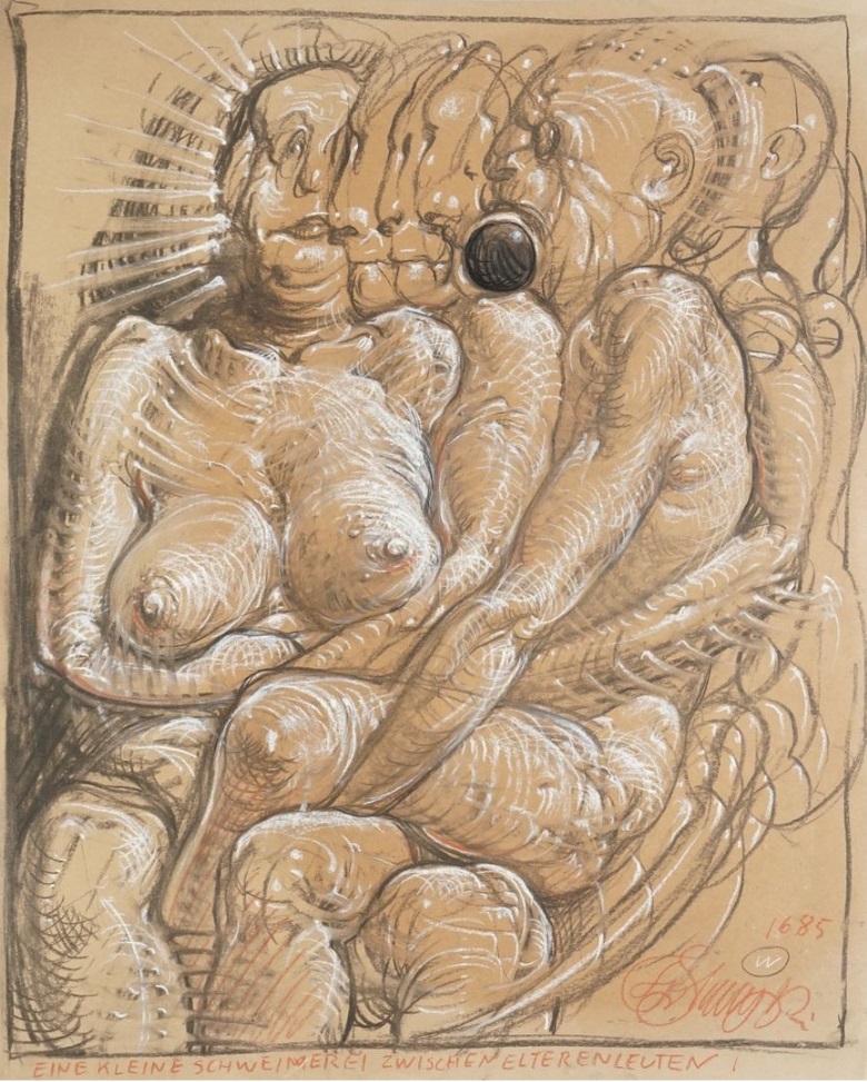 Lot 117. STAROWIEYSKI Franciszek, 1930-2009. Eine kleine schweimerei zwischen elterenleuten, 85, dessin aux trois crayons sur papier beige (traces de frottements et plis, petite déchirure sur le bord inférieur), signé et daté en bas à droite, titré en bas, 61 x 48,5 cm. Estimate 1,200 – 1,500 euro. Rossini. 06/29/22. Sold 2,100 euro