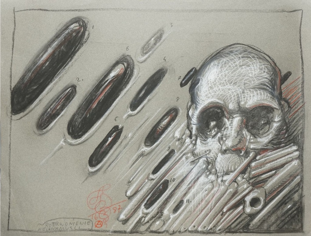 Lot 118. STAROWIEYSKI Franciszek, 1930-2009. Crâne, 1987, pastel sur papier gris (quelques traces de frottements, traces de plis aux angles et infimes déchirure sur un bord), monogramme, titre et date en bas à gauche, cachet de la galerie AREA (Paris) au dos, 50 x 65 cm. Estimate 800 – 1,200 euro. Rossini. 06/29/22. Sold 750 euro