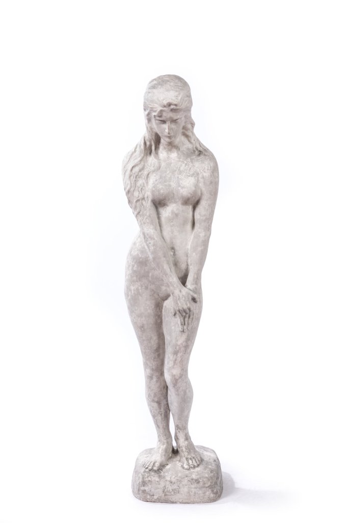 Lot 105. Boleslas Biegas (Koziczyn, 1877-1954, Paris). Ève, modèle créé en 1910. Plâtre de fonderie. Signé, situé Paris, inscrit “Marea”, daté 1910. Haut. 117 Larg. 28 Prof. 28 cm. Provenance: – Société Historique et Littéraire Polonaise, Paris, – collection Robert Vallois, Paris, – collection de M. et Mme K., Touraine. A foundry plaster by Boleslas Biegas entitled “Eva”. Designed in 1910. Bibliographie: Xavier Deryng, “Boleslas Biegas, Sculptures – peintures”, catalogue de l’exposition au Trianon de Bagatelle, édition Reynes, Paris, 1992, épreuve en bronze du musée de Varsovie d’Alexis Rudier reproduit sous le n°24 p. 97.