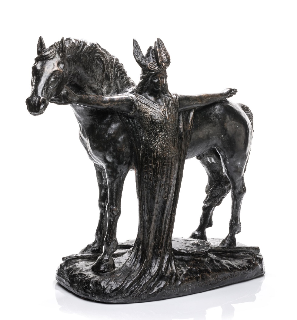 Lot 106. Boleslas Biegas (Koziczyn, 1877-1954, Paris). Félia-Litvinne-Brünnhilde, modèle créé en 1911. Bronze signé, titré, numéroté 2/8 et marqué “Fonte T Ross 2010”. Haut. 48,5 Larg. 57 Prof. 17 cm. Provenance: – Société Historique et Littéraire Polonaise, Paris, – collection Robert Vallois, Paris, – collection M. et Mme K., Touraine.