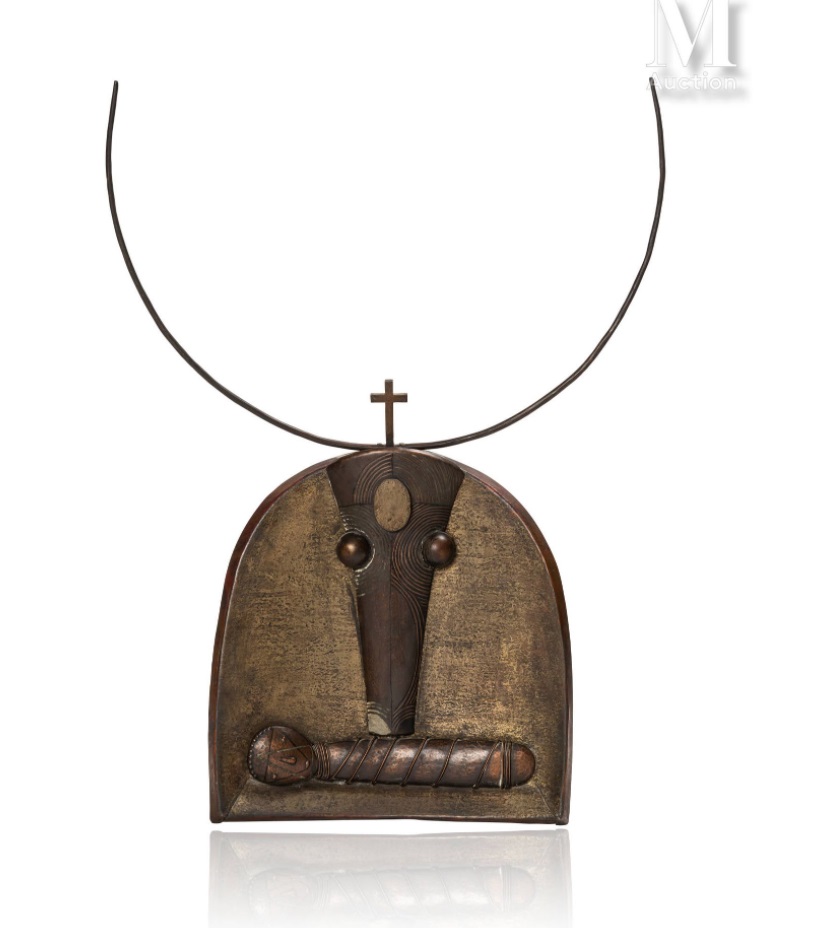 Lot 27. ean LAMBERT-RUCKI (Cracovie 1888- Paris 1967). Totem au taureau et à l’enfant. Réalisé en 1956. Sculpture en taule martelée polychrome et métaux forges. 81 x 60 x 5 cm. Signé et daté au dos en bas à gauche de la taule “J. Lambert-Rucki 1956”