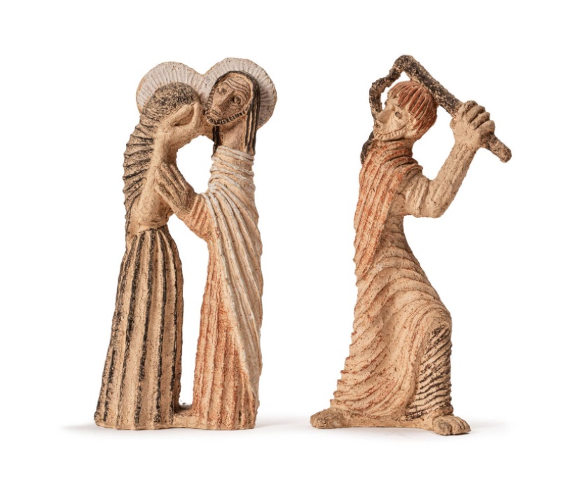 Lot 29. Jean LAMBERT-RUCKI (Cracovie 1888- Paris 1967). Scène religieuse, 1943. Terre crue polychrome. 44 x 19 cm x 9 cm pour le groupe de deux. 45,5 x 20 x 10 cm pour le personnage seul. Signé et daté au dos du groupe des deux personnages “J.Lambert-Rucki 1943” (Restaurations). Estimate 1,000 – 1,500 €. Millon. 09/28/22
