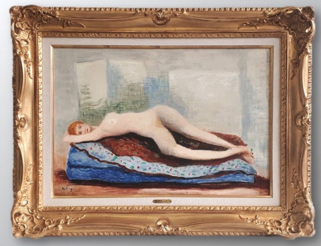 Lot 76. KISLING Moïse 1891-1953 : Nu étendu. Huile sur toile SBG 38×55 cm. Certificat de Michel Kisling, petit-fils de l’artiste. Provenance : Ancienne collection Kisling. Estimate 35,000 – 45,000 euro. Chaville Encheres. 07/10/22. Sold 21,000 euro.