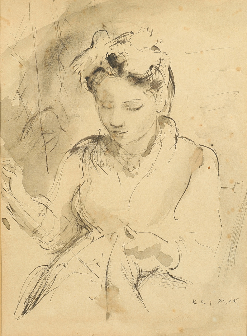 Lot 2266908. LUDWIG KLIMEK, (POLISH, 1912-1992). A WOMAN SEWING. Preparatory study, signed lower right and inscribed with title in French verso together with the artist’s address in Paris, pen, ink and wash. 24 cm x 17.5 cm (36 cm x 28.5 cm). Starting 30 euro. The Auction Hub. 07/13/22. Sold 30 euro