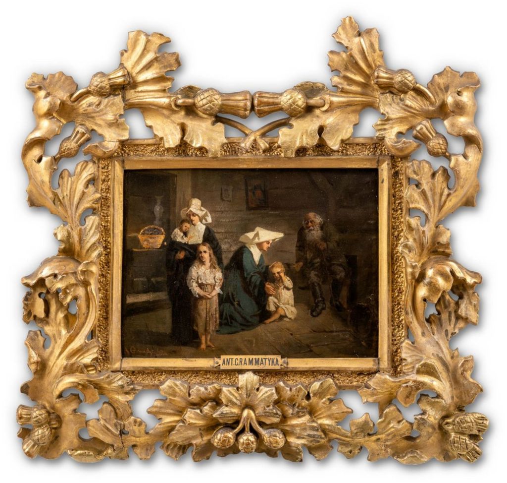 Lot 44. Gramatyka, Antoni (Kalwarya Zobryydowska, wohl Krakau 1841-1922). Im WaisenhausZwei Nonnen, sich um drei Geschwister kümmernd. Sign. u. dat. (1)860. Lwd. auf etwas größere Lwd. aufgezogen. 19×25 cm. Rückseitig Nr. 10 u. T.I.N. 19. Verblasster polnischer Klebezettel. Vergoldeter, von Disteln und Blättern durchbrochener Holzrahmen. Estimate 1,600 euro. Leo Spik. 06/30/22. Sold 1,200 euro.