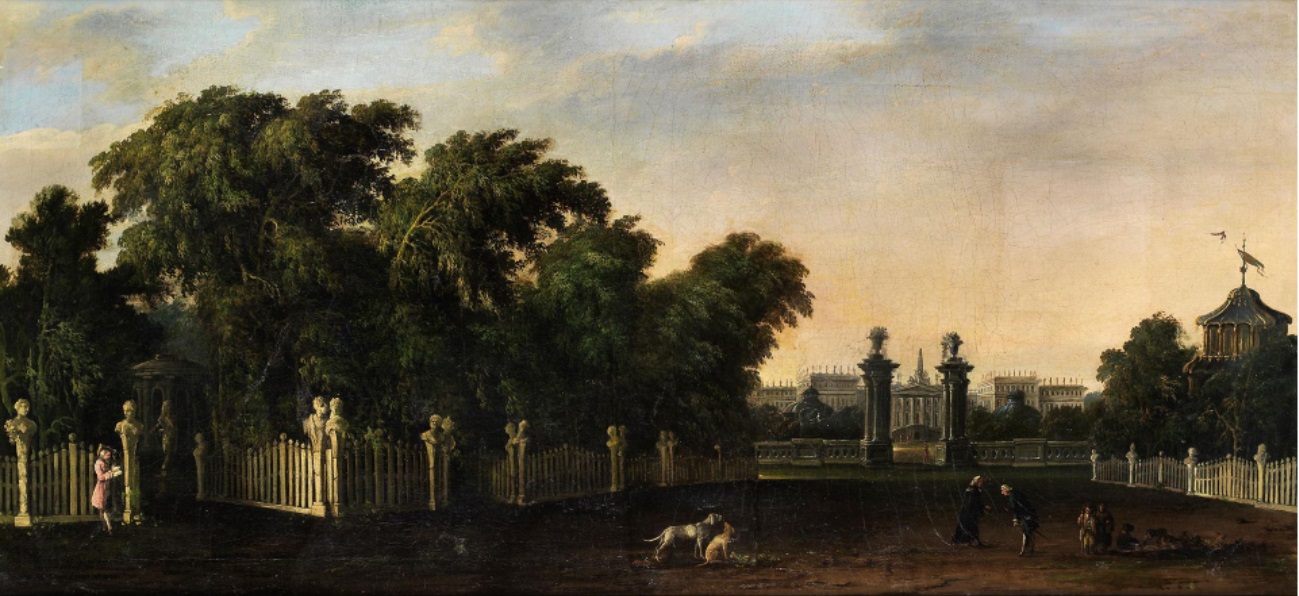 Lot 529. Bernardo Bellotto, 1721 Venedig – 1780 Warschau, Umkreis. Devant l’entrée du parc du château. Huile sur toile. Doublée de peinture.63 x 134 cm. Dans un cadre en bronze décoré en relief. Une clôture de parc divisée par des bustes d’hermès délimite un parc de château en partie arboré et sert de toile de fond pour la représentation des personnages représentés ici en vêtements d’époque. Derrière, un bâtiment du château s’étend largement, dans l’esprit du vénitien Bernardo Bellotto. Estimate 8,000 – 10,000 euro. Hampel. 09/22/22