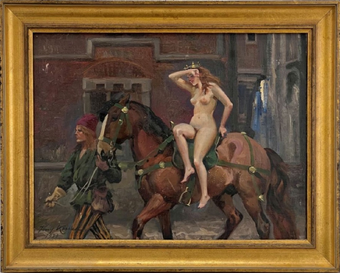 Lot 3060. Gemälde – Jerzy KOSSAK (1886 Krakau / Polen 1955) “Stadtkulisse, im Vordergrund Frauenakt mit Krone auf Pferd sitzend“, l.u. signiert, datiert 1930, Öl auf Karton, Maße Darstellung ca. 36×48 cm, Altersspuren, Rahmen. Opening 300 euro. Keup. 10/15/22