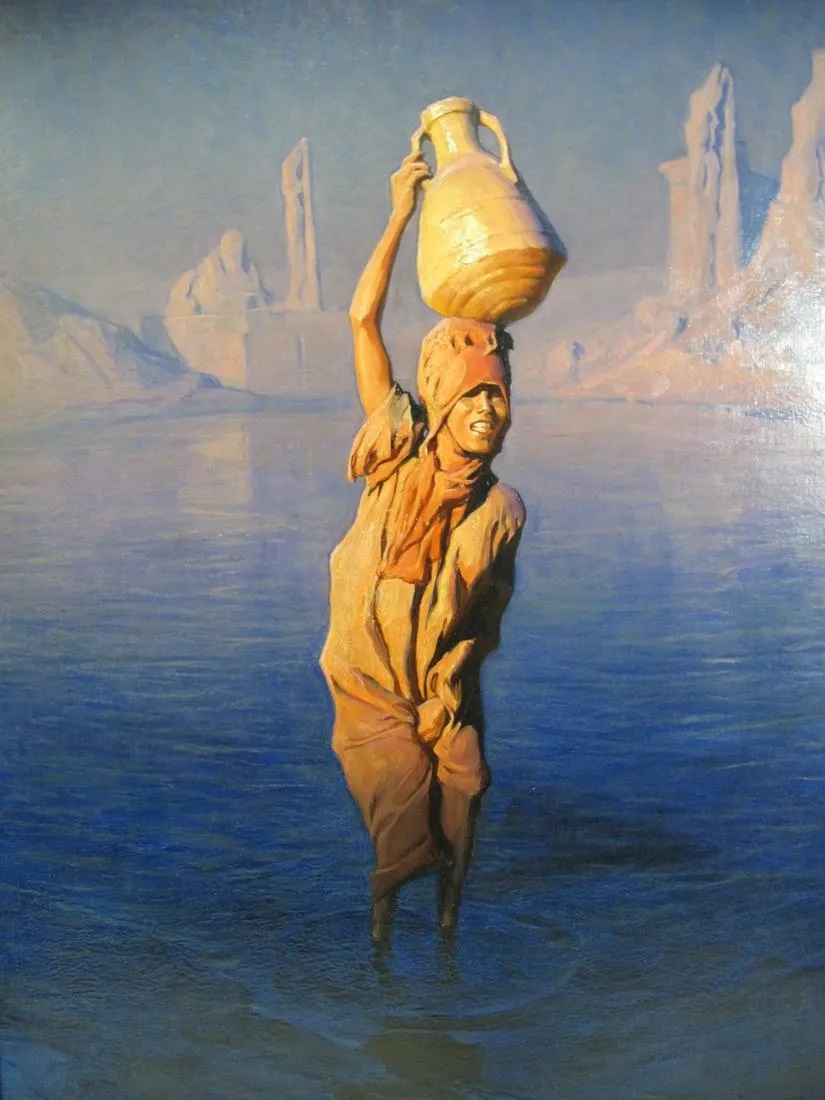 Może to być obraz Adama Styki lecz dla kolekcjonera o mocnych nerwach. Na moje oko wygląda dobrze, choć malowany dość ‘gładko’, pewnie 100 lat temu. Zmyta sygnatura odstraszy jednych a będzie przekonywująca właśnie z powodu jej szczątkowości dla drugich. Obraz pomimo swej wielkości płótna wygląda na przycięty – sygnatura jest niemal na marginesie. Płótno jest stare, napisy na ramie wyglądają na autentyczne. Bez proweniencji i wyraźnej sygnatury handlarz nie kupi tej pracy (chyba, że domaluje flamastrem). Inna rzecz, że obraz jest drogi (w USA), duży i kosztowny transport do Polski, wycena wysoka a ewentualny zarobek w Polsce jest bardzo ryzykowny. Tematyka ‘zakochanej pary arabskiej’ miałaby powodzenie a temat kobiety z dzbanem nad Nilem mógł zwietrzeć przez 100 lat. Jeśli ktoś ma inną opinię na temat autentyczności to zapraszam do uzasadnienia. Buźka dla Desy i innych handlarzy.
