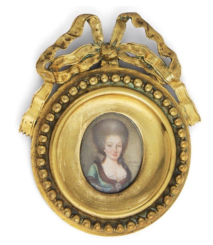 Oval miniature, signed and dated on the right De Lusse/Pinxit 178-, depicting the sister of the King of Poland Stanisłas Auguste PONIATOWSKI, known as Madame Krakow, in bust, three-quarter right, in green dress edged with fur. In its original round gilt bronze frame bordered with a frieze of pearls and topped with a ribboned bow. On the back a handwritten paper in Polish identifying the subject sabella z Poniatowska hetmanowa Graf Branicka Pani krakowska Babka Isabelli Starzynski. 4.4 x 3.5 cm. Frame: 12.5 x 10.5 cm. Provenance: Izabella STARZYNSKA (1804-1897), born Countess MOSTOWSKA, wife of Edouard STARZYNSKi (1807-1864). To his son the count Boleslaw STARZYNSKI (1834-1917), historian born in Poland and established in Paris. Bequeathed by the latter to his cousin Joseph Marie Clément de NICOD de NEUVILLE, count of MAUGNY (1873-1944) and to his wife Margaretha, called Rita, Jeannette Émilie BUSSE (1882-1937). Then by descent. Estimate 600 – 800 euro. Fraysse @ Associes. 10/19/22