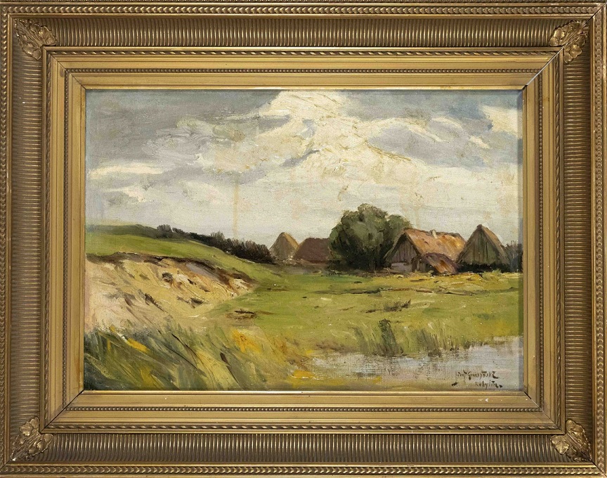 Lot 7292. Josef Graczynski (1866-1939), Polish painter, Landscape with huts on the lakeshore, oil on canvas, signed and inscribed ”Kobylin” lower right, 33 x 50 cm, framed 53 x 68 cm. Opening 450 euro. Historia Auktionshaus. 11/07/22