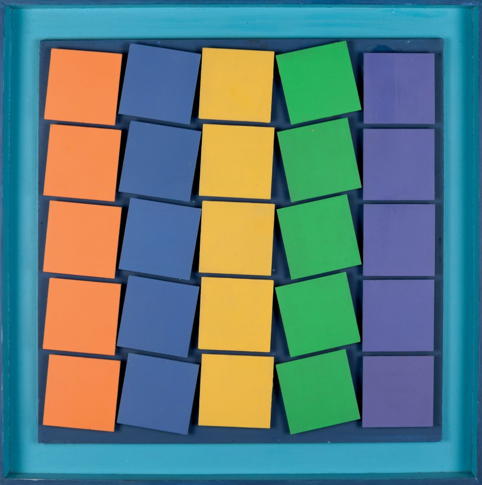 Lot 55. Henryk Stazewski (1894-1988). Relief nr. 38, 1969. Acrylic on metal and fiberboard. Signed, titled and dated on the reverse. Acrylic on metal and fiberboard; signed, titled and dated on the reverse, 60,5 x 60 x 4,5 cm – 23 7/8 x 23 5/8 x 1 3/4 in. PROVENANCE: Acquired directly from the artist; To the present owner through successive transfers. EXHIBITION: Bordeaux, CAPC musée d’art contemporain de. Bordeaux, Anka au cas par cas, June 23-December 31, 2022. This work is currently on view at the CAPC musée d’art contemporain de Bordeaux and will be available to the purchaser at the conclusion of the exhibition. Estimate 100,000 – 150,000 euro. Tajan. 11/23/22. Sold 100,000 euro