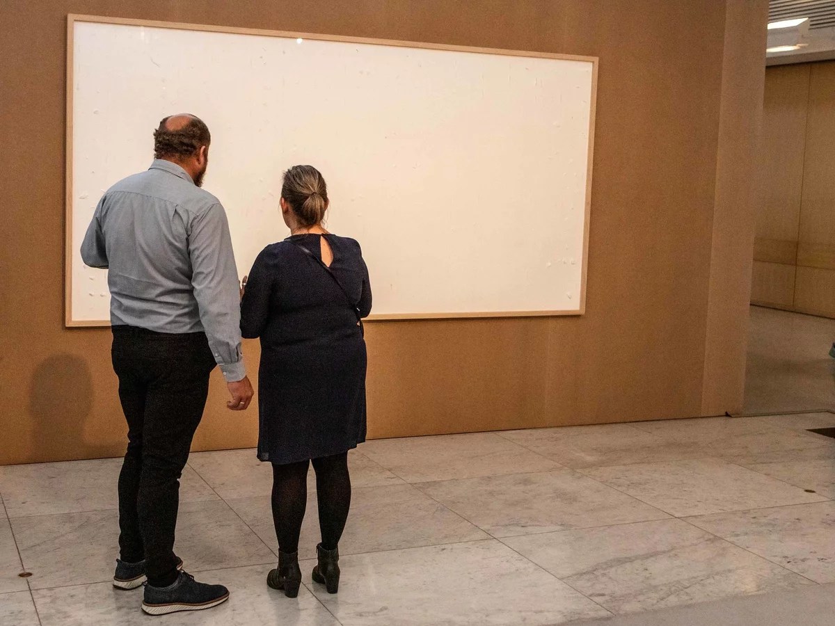 Visitors view a blank canvas that is part of “Take the Money and Run,” by Jens Haaning, at the Kunsten Museum of Modern Art in Aalborg, Denmark. The piece is part of an exhibition called Work It Out, which explores people’s relationship with work. Niels Fabæk/Kunsten Museum of Modern Art