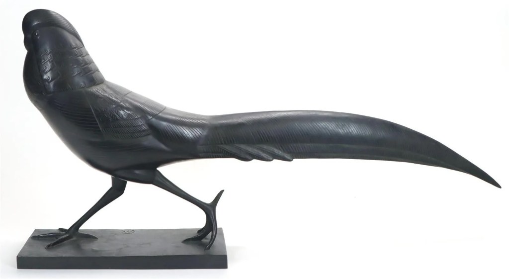 Lot 2117. Magdalena Gross (1891-1948). Art Deco bronze sculpture of a pheasant, initialed at the base, also with Polish foundry mark “L.KRANC i T.LEMPICKI | WARSZAWA”. 13”h x 28”w x 4.25”d. Estimate $5,000 – 8,000. Alderfer Auctions. 12/08/22. Sold $9,500