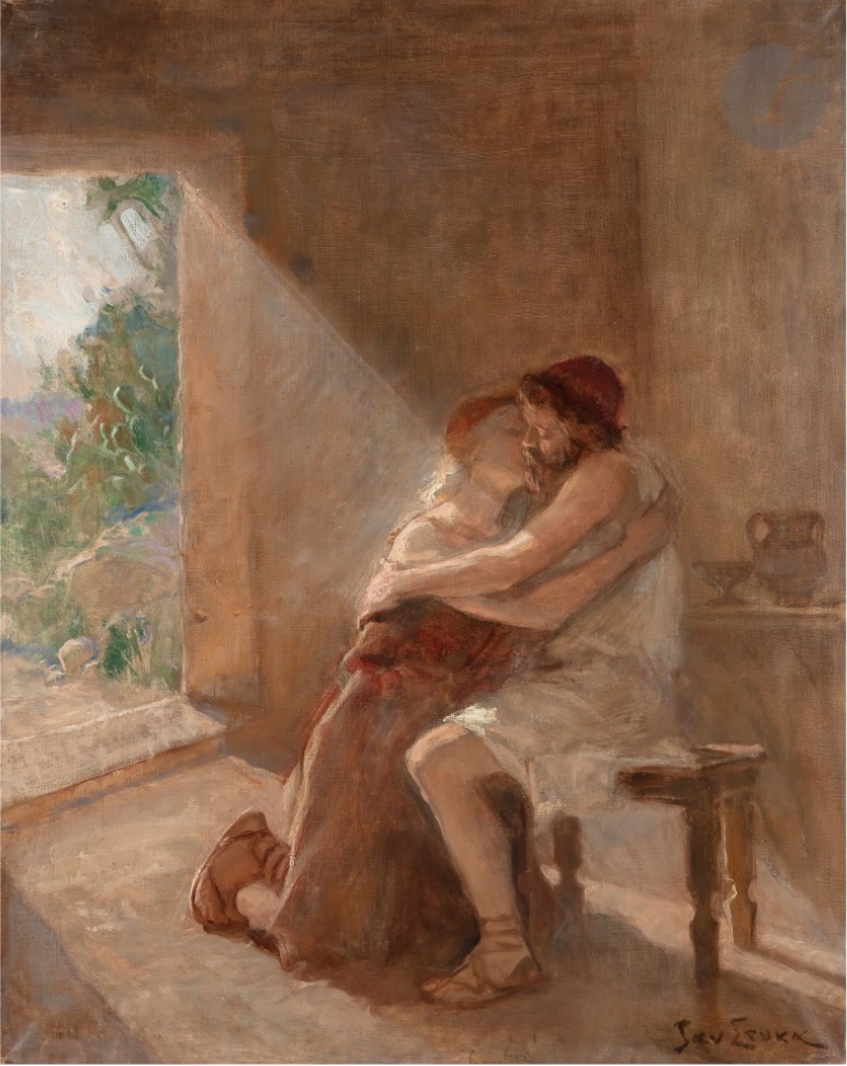 Lot 18. Jan STYKA (1858-1925). Ulysses embracing his beloved son [1901]. Oil on canvas. Signed lower right. Titled on the back of the frame and on a label affixed to the canvas. (Restorations.) 78 x 61 cm Attached Le Figaro – artistic supplement, Thursday June 28, 1923, devoting an article to the exhibition of works from the cycle L’Odyssée held at the Salon of the Society of French Artists. One of about 60 illustrations of Homer’s Odyssey (t. III, Adventures of Ulysses, Book of Eumaios, Paris 1923, reproduced p. 288). LXIII. – Ulysses embraces his beloved son At these words he sits down. The hero sighs / Towards his father and embraces him while crying; / With a painful pleasure both are fed, / The eagles, the vultures less long moan, / When a shepherd took away their children whose rise / Did not dare in the air to spread out again. / Both to weep taste sad charms; / The sunset would contemplate their tears, / Telemachus finally would have uttered these words: / “My beloved father! speak: which sailors / Have led you to Ithaca, and what is their homeland, / You did not come on foot to our beloved island.” Estimate 3,000 – 4,000 euro. Ader. 12/19/22. Sold 3,600 euro