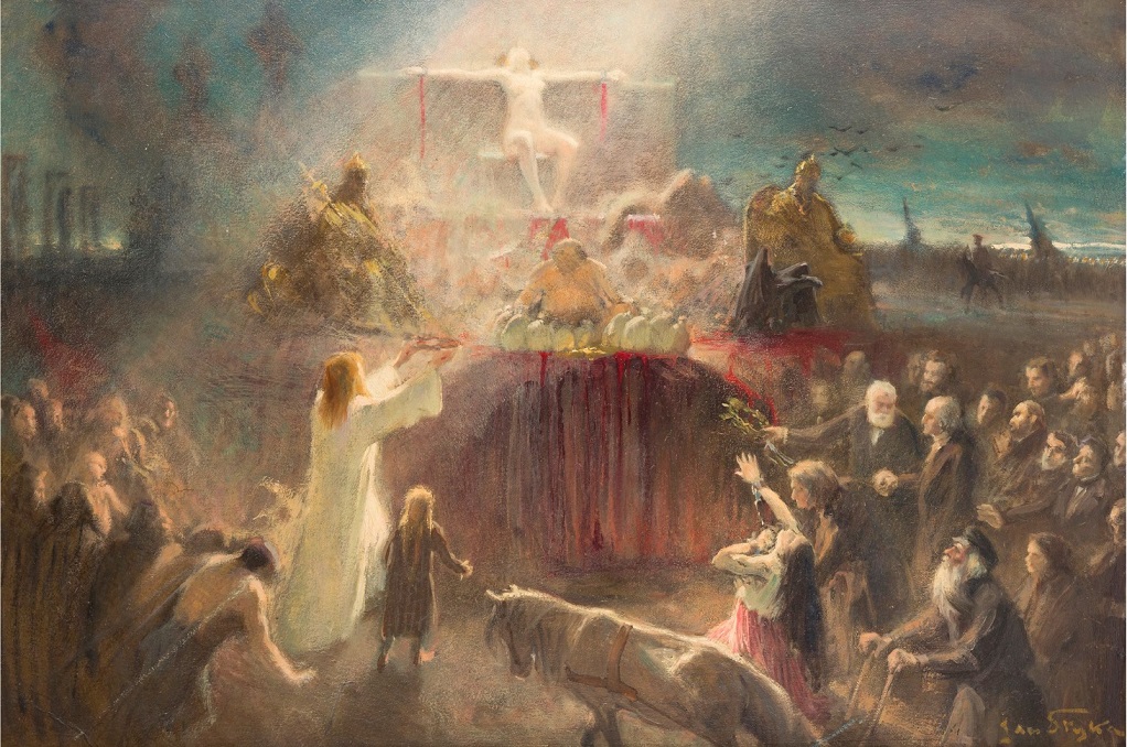 Lot 19. Jan STYKA (1858-1925). Humanity [Ludzkość ciemiężona przez trójgłowa hydrę]. Oil on cardboard. Signed lower right. On the reverse, a sketch of a woman’s portrait. Fragment of an exhibition label on the back. 55.1 x 81 cm Exhibition : Traveling exhibition of the works of Jan, Tadeé and Adam Styka [Okrężna wystawa dzieł Jana Styki, Tadeusza Styki, Adama Styki], Warsaw 1930, no. 24. This painting served as an illustration for the poem Trojglowa hydra, part of Jan Styka’s 1916 publication Z lez, krwi i zelaza honoring Poles serving in the French Army (p. 25). On the back of the painting is a sketch of a woman’s portrait as well as annotations listing personalities (probably those represented in the lower right of our painting): Mickiewicz, V. Hugo, Pasteur, Michelet (Jules?), Vrchlicky… .Estimate 8,000 – 10,000 euro. Ader. 12/19/22. Sold 8,500 euro