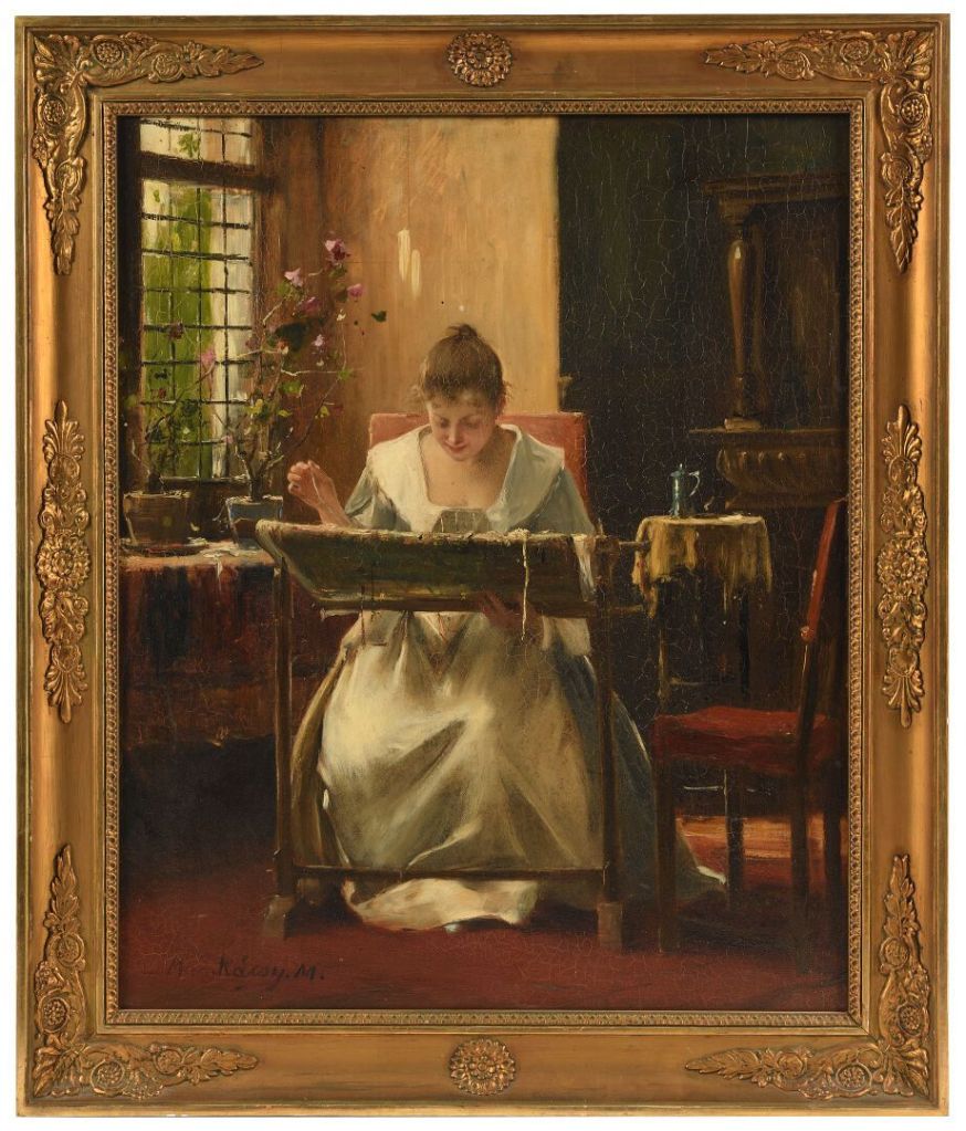 Lot 40. Makary Konstanty MANKOWSKI (1861-1897). Young woman at her work. Oil on parquet panel signed on the lower left and bearing on the reverse an old label of the Miroiterie GOURMAUD 15 Rue des Lices in Angers. 65 x 53 cm. Estimate 1,000 – 1,500 euro. Hotel des vendes Giradeau. 11/25/22. Sold 47,000 euro