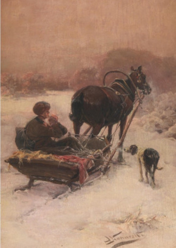 Lot 246. Konarski, Joseph, tätig in Polen 19/20 Jh. Bauer auf einem Pferdeschlitten. Öl auf Holz. 22 x 16cm.Signiert unten rechts: J. Konarski. Rahmen. Estimate 800 – 1,000 euro. Van Ham. 01/25/23. Sold 900 euro