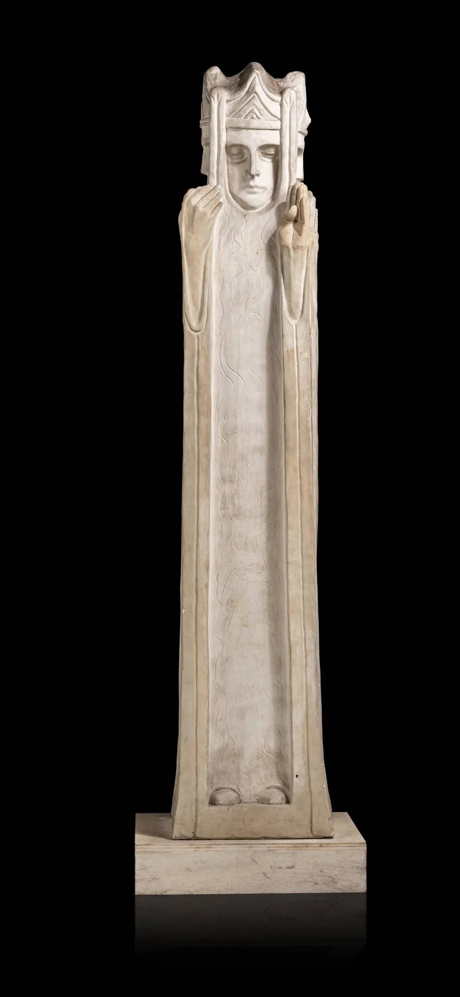 Lot n°73. Boleslas BIEGAS (Koziczyn 1877- Paris 1954) Swiatowid Réalisé en 1912 Plâtre original à patine blanche et beige nuancée Hauteur : 203 cm Largeur : 34 cm Profondeur : 35 cm Signé sur la base “B. Biegas” et sur une autre face titré “Cztery Strony Surata” (Manques, éclat au nez) Avis d’inclusion dans le catalogue raisonné des sculptures de Boleslas Biegas en cours d’élaboration par Xavier Deryng, sous l’égide de la Société Historique et Littéraire Polonaise/Bibliothèque Polonaise de Paris, légataire universel de l’artiste. Un droit de tirage est accordé sous réserve de remettre un exemplaire à la société Historique et Littéraire Polonaise. Swiatowid était la principale divinité polycéphale adorée par les anciennes tribus slaves, qualifié de « deus deorum » par les chroniqueurs du Moyen Âge, comme Helmold de Bossau et Saxo-Grammaticus, Svantovit était considéré comme le Dieu suprême du panthéon slave. En 1848, une colonne en pierre, de 2,57 mètres de hauteur, à quatre faces fut découverte en Ukraine, dans le Zbrucz, affluent du Dniestr, à Horodnica. Elle fut transportée dans la propriété du comte Mieczyslaw Potocki qui l’offrit à la Société des Sciences de Cracovie. La statue fut ainsi baptisée en polonais Swiatowid et exposée dans le vestibule du siège de l’Académie des Sciences Polonaise, située non loin de l’École des Beaux-Arts rue Slawkowska. Le Swiatowid de Zbrucz marquera ainsi profondément Biegas au cours de ses études. Cette idole constituera l’une des sources du primitivisme et du géométrisme de ses sculptures, comme le soulignait dès 1902, Stanislas Gierszynski dans sa contribution au numéro spécial de la Plume : « Swiatowid » l’antique dieu de la mythologie slave renait avec lui. Ses quatre faces providentielles embrassent les autres coins de l’univers » Swiatowid apparaitra également dans les pièces de théâtre de Biegas. En 1904, dans son drame, Lechit, il décrit un Sphinx à la tête énorme à quatre faces et en 1915, dans la dernière scène des Mystères de la Guerre, Swiatowid intervient pour annoncer la résurrection de la Pologne. Provenance : Atelier de l’artiste Inventaire de Jan Szymanski, n° 62 Galerie Jan Krugier, Genève, 1975 Atelier de Boleslas Biegas (1877-1954), sculptures et tableaux par le ministère de Me Pierre Cornette de Saint Cyr, Paris, Nouveau Drouot, Mardi 30 juin 1987, n° 77. Exposition : Salon de l’Union Internationale des Beaux-Arts et des Lettres, Paris, Champs-Élysées (Alcazar d’Été), 1er octobre – 3 novembre 1911, n° 91, Les quatre coins du monde, plâtre. Le catalogue précise que la version en marbre était proposée pour 12. 000 francs. Biegas avait également envoyé à ce Salon deux autres plâtres, La Terre, Le Soleil ainsi que Le Penseur (Naissance de la pensée) en bronze. Edvard Munch avait également participé à ce salon avec six peintures. Exposition Boleslas Biegas, Galerie Jan Krugier, Genève, 1975, reproduit p. 19, n° 41. Bibliographie : Xavier Deryng, Boleslas Biegas, sculptures-peintures, catalogue d’exposition, Paris, trianon de Bagatelle, 1992, pp.33-39. Estimation : 20 000 € – 25 000 €. Millon et Associes. 02/15/23. Sold 58,000 euro