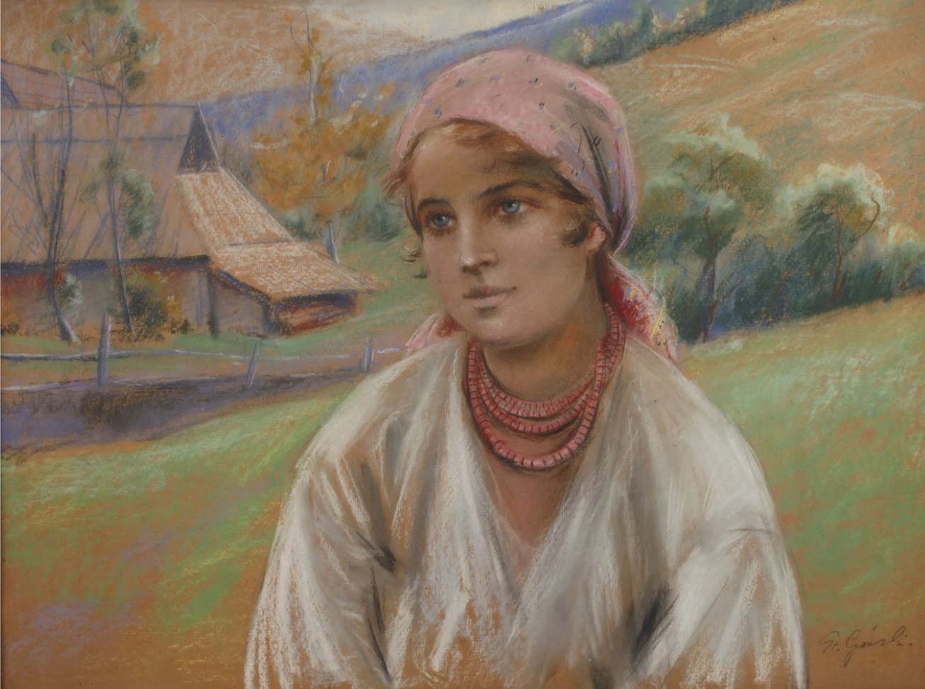 Lot 3955. Stanislaw Gorski, Young Peasant Woman. Portrait of a young woman wearing a headscarf and gazing into the distance in front of a spring-like mountain landscape – probably Tatra Mountains, pastel on cardboard, mid 20th century, signed lower right “St. Górski”, cardboard somewhat browned, behind glass in a gold-bronzed stucco frame, folding dimensions approx. 51.5 x 68 cm. Artist info: also Stanisław Górski, Polish painter (1887 Koscian to 1955 Kraków), initially a pupil at the Cracow Industrial School until 1908, studied at the Cracow Academy of Fine Arts under Józef Pankiewicz from 1909-14, further training under Teodor Axentowicz from 1916-17, 1944 destruction of his life’s work in a studio fire, exhibited at various venues such as the Zachęta Gallery in Warsaw, the exhibitions of the Society for the Promotion of Fine Arts Warsaw (Towarzystwo Zachęty Sztuk Pięknych w Królestwie Polskim, abbr: TSZP) and exhibitions in Kraków, Poznan, Kalisz and Piotrków, active in Kraków, Source: Saur “Bio-Bibliographisches Künstlerlexikon” and Internet. Estimate 80 – 120 euro. Mehlis. 02/23/23. Sold 700 euro