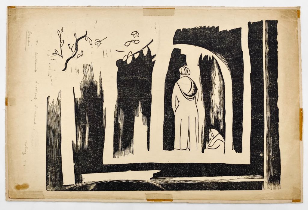 Lot 124. Moïse Kisling – Two Women – 1916. Woodcut. Signed in pencil. Sheet size: 45X29 cm. Print size: 36 X 27 cm. Good-fair condition: some folds and wear, stains on the margins. Moise Kisling (1891-1953) was a Jewish painter born in Poland, who lived and worked most of his life in the Montparnasse district of Paris. Kisling befriended important artists of his time and was influenced by their style, including Modigliani and Chagall. Known mainly for nude paintings and surrealist portraits. Start $50. Tre Zouze. 03/28/23. Sold $180.