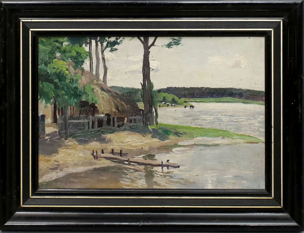 Lot 8689. Wywiórski, Michael Gorstkin (1861 Warschau/Polen – Berlin 1926). Sommerliches Seeufer mit Hütte. Öl/Lwd. auf Karton (min. Farbfehlstellen am u. Rand), li. u. sign. 22x 32 cm. Dannenberg. 03/28/23. Sold 1,300 euro