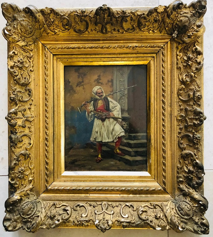 Obraz o niewielkim wymiarze, 16*21 cm, z ekstymacja 2000-3000€, przedstawiajacy uzbrojonego w karabin i kindzal mezczyzne. Obraz niewatpliwie dobry chociaz maly, dlatego tez wycena wydawala mi sie nieco wyzsza od cen za Ajdukiewicza na polskim rynku aukcyjnym. Ku mojemu zaskoczeniu obraz ten, nieco wiekszy od miniatury sprzedany zostal za 11.000 €