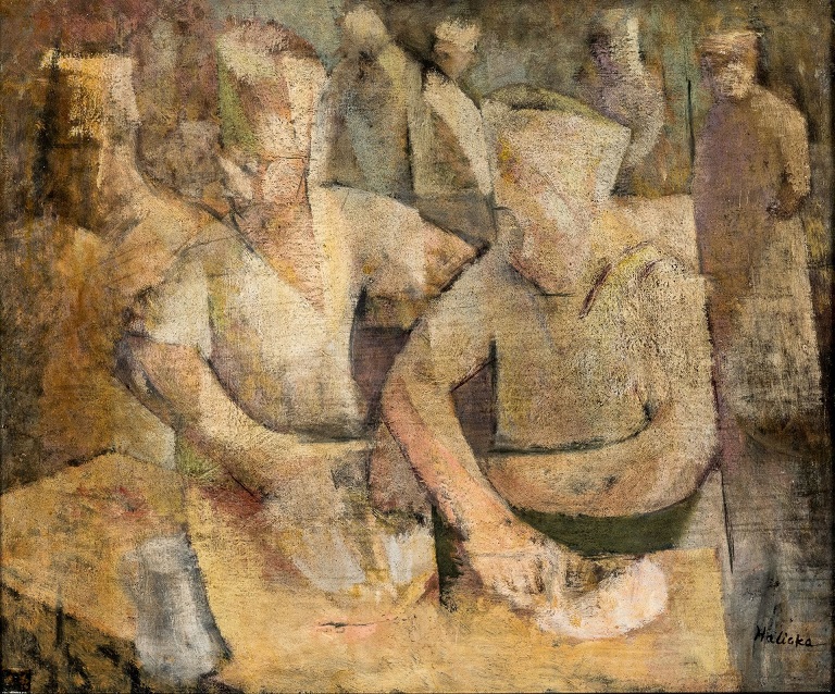 Lot 1055. Halicka Alice 1895 Krakau – 1975 Paris. Studium an einer privaten Kunstschule in Krakau, Heirat mit dem Maler Louis Marcoussis, gehörte bis 1921 dem Kreis der Kubisten an, kreierte Kostüme zu Strawinskys Ballett, internationale Ausstellungen. Öl/Lw. In der Bäckerei mit Bäcker beim Kneten des Teigs. U.r. sign. Verso Skizze. Liebespaar. (Rest.). 65 x 76 cm. Opening 1,500 euro. Pege. 04/28/23. Wycofany z aukcji