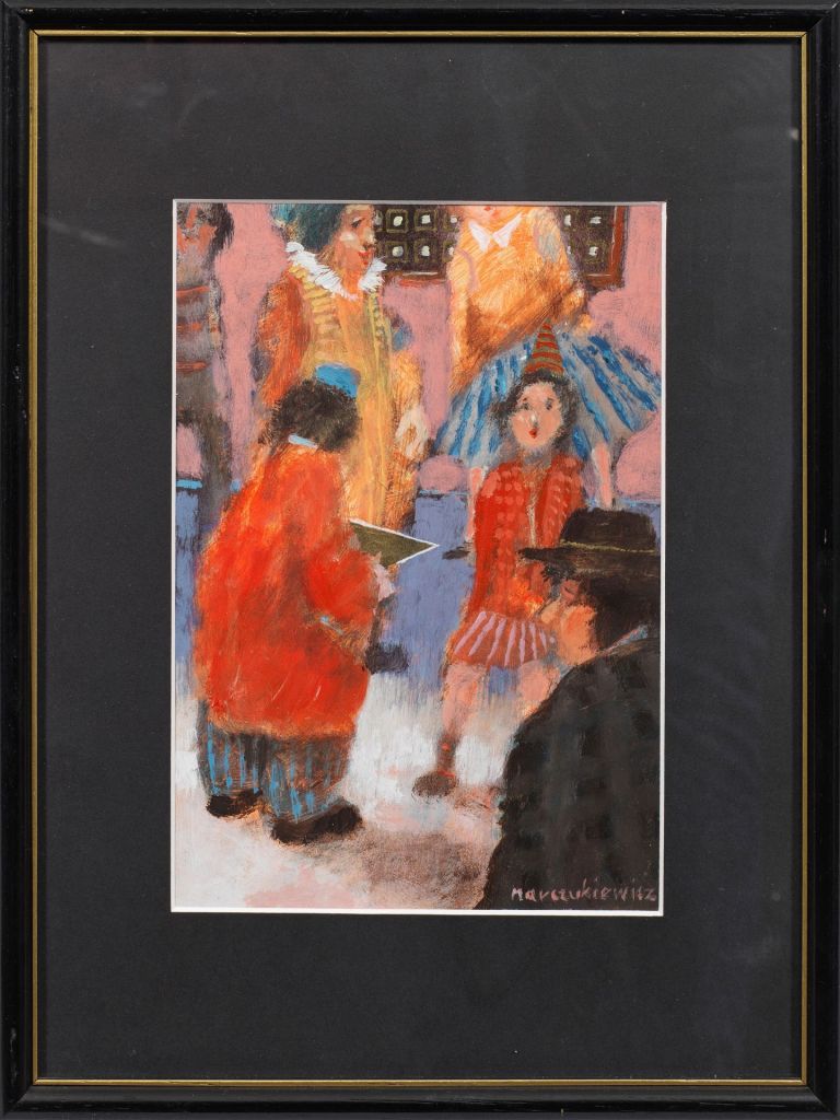 Lot 3110. Adam Marczukiewicz (Geb. 1958 in Olkusz). Karneval. Der polnische Künstler Marczukiewicz studierte an der Akademie in Krakau Grafik, Malerei im Atelier von Prof. Zbyslaw Maciejewski und Lithographie bei Prof. Wlodzimierz Kunz. Öl/Papier. R. u. sign.; Darstellung 26,5 cm x 18,5 cm (Passepartoutausschnitt). Rahmen. Gouache on paper. Signed. Opening 150 euro. Schloss Ahlden. 05/13/23. Not sold