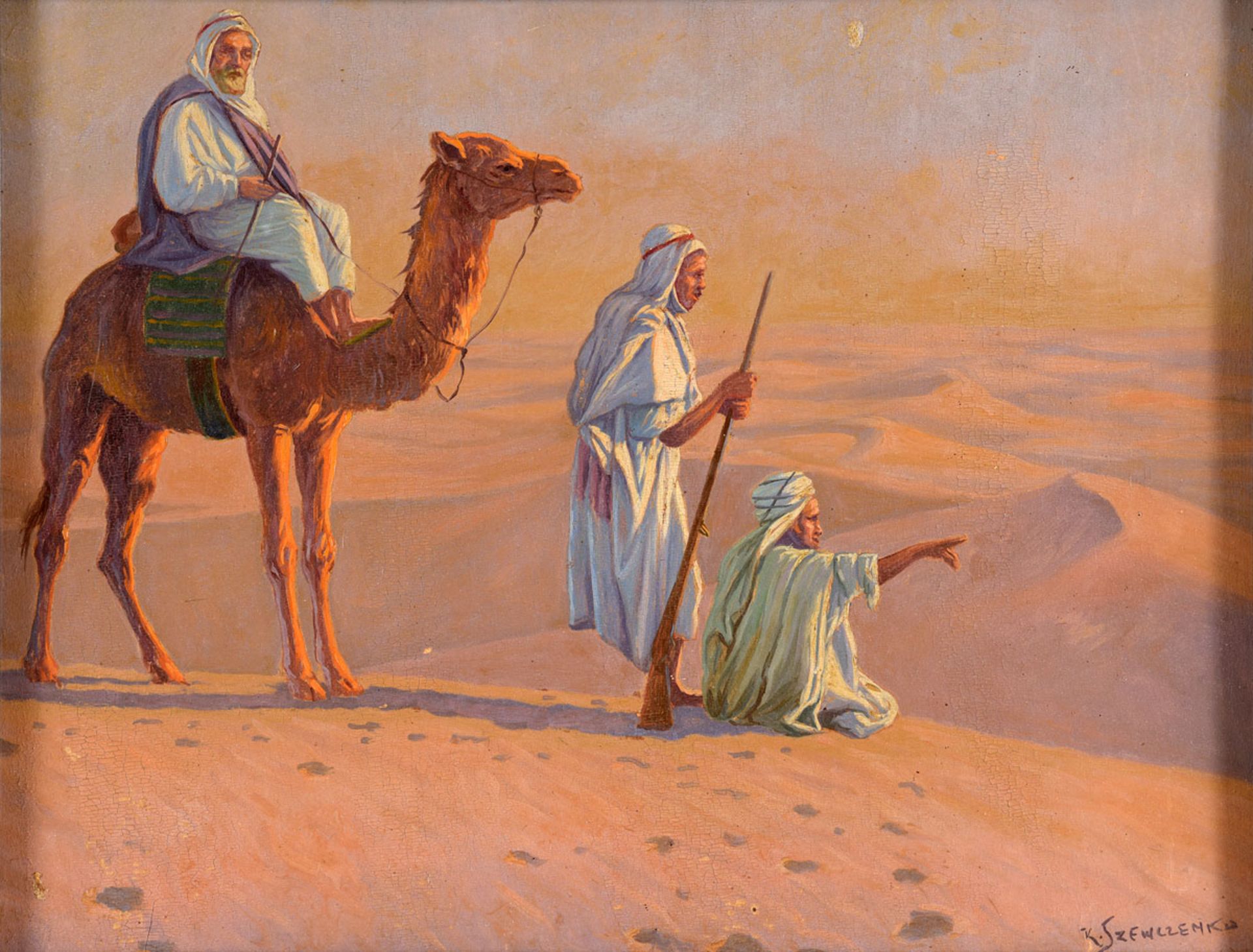 Lot 1344. Szewczenko, Konstantin 1915 Lemberg – 1991 Warschau. Spähende Araber. Signiert. Öl/Malk., 40 x 50 cm. Originalrahmen: 63 x 74 cm. Opening 150 euro. Dusseldorfer. 05/13/23