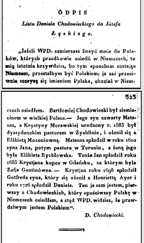 Na polskim rynku dominują miedzioryty i akwaforty Daniela Chodowieckiego, których to podobno wykonał ponad 2,000 w swoim życiu. Obecnie trafia się pastel w wykonaniu tego artysty przedstawiający Marię Magdalenę. Daniel Chodowiecki to artysta uważający się za Polaka, choć niektórzy uważali i uważają go za zniemczonego Polaka. W jednym z archiwalnych czasopism odnalazłem wydrukowaną kopię listu Chodowieckiego na temat swojej narodowości, pisany piękną polszczyzną. Podaje wydruk poniżej bo czasami uda się coś ciekawego upolować na rynku i włączyć do kolekcji.
