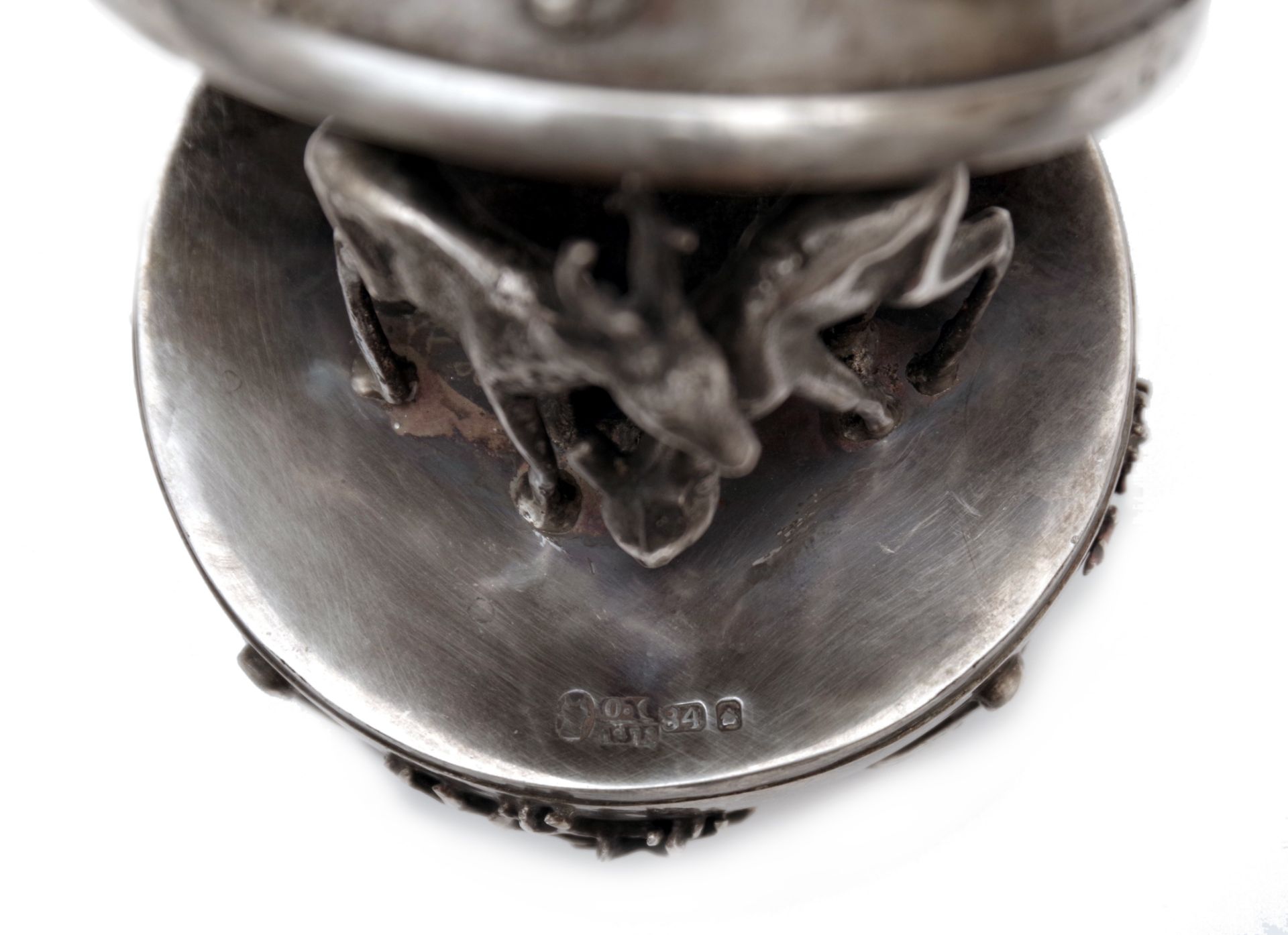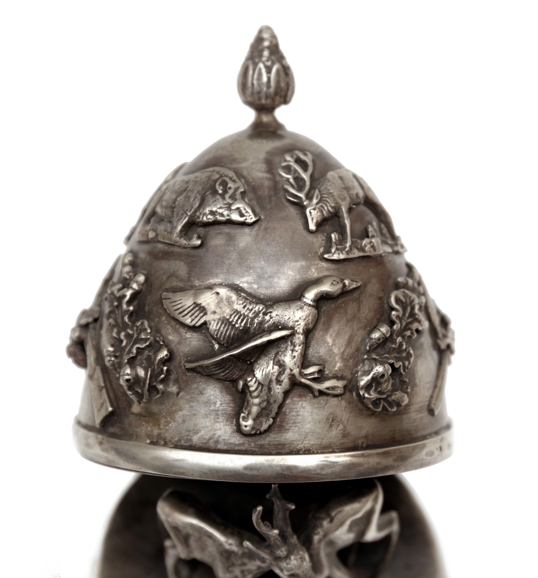 Lot 403. The solid silver Russian Imperial egg atop four scrolled feet opens to reveal figural pair: dear and a female roe deer. An exterior with applied decorations and accents comprising of a flying goose, a rabbit perched atop a shotgun, stags, boars and foliate sprays. Hallmarked with assayer´s mark of Joseph Sosnkowski, “84” along with pictorial mark (Cyprian Labecki) and a city stamp of Warsaw. Warsaw 1872, 13.3 cm height, total weight: 373,49 g. Condition 2. Starting 2,000 euro. Auktionshaus Antikvity Praha Auctions. 06/03/23. Sold 2,000 euro