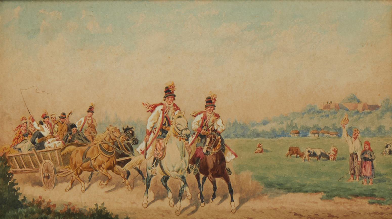 Lot No. 138-079817/0024. Kajetan Kosinski (Polen 1847-1935). Hochzeitsumzug, signiert K. Kosinski, Aquarell auf Papier auf Karton kaschiert, 18 x 31 cm, gerahmt, leicht gebräunt. Opening 300 euro. Dorotheum. 06/20/23.