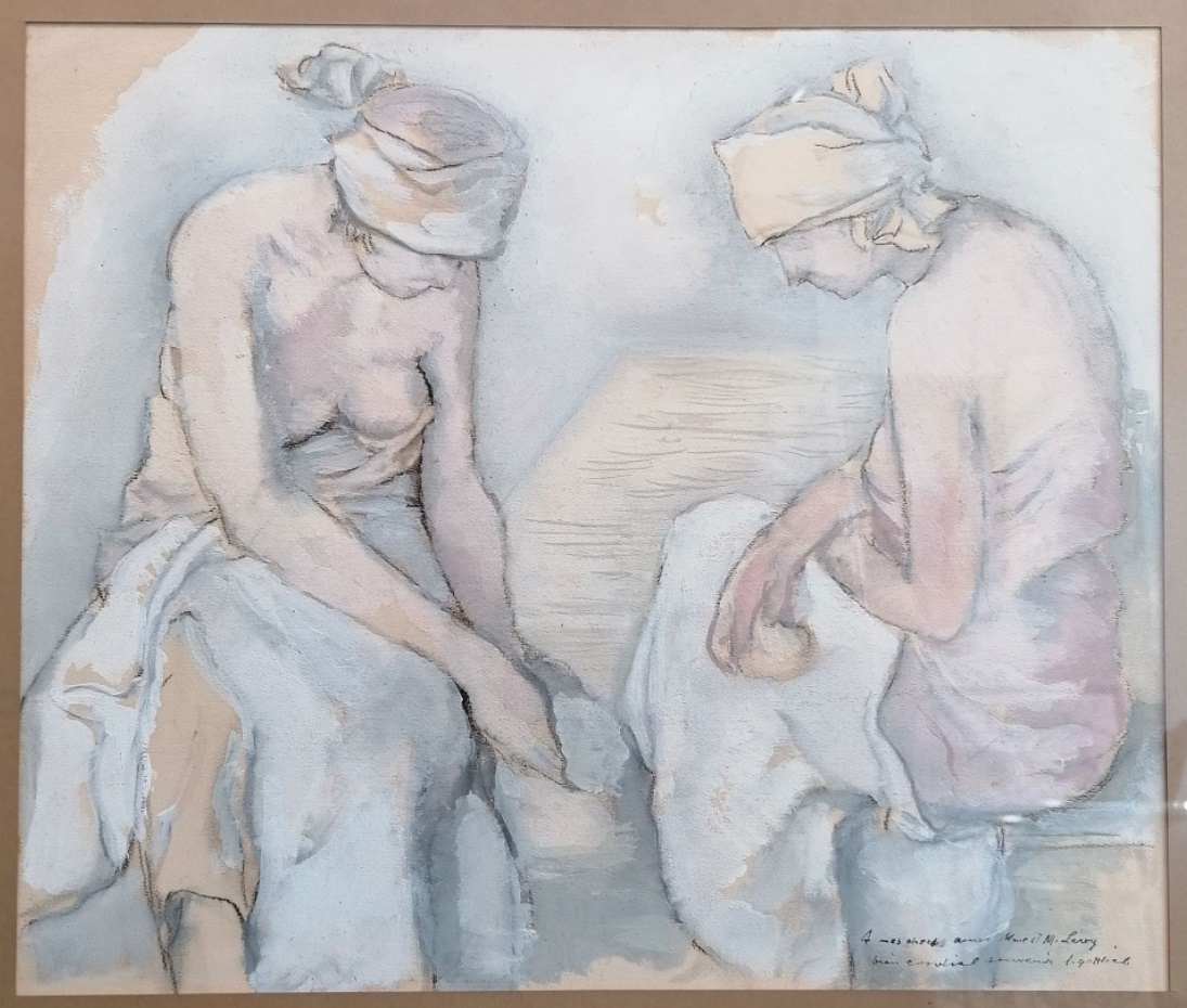 Lot 131. Leopold GOTTLIEB (1879-1933). Femmes à la toilette. Gouache et crayon sur papier. Signé en bas à droite et dédicacé “A mes chers amis Mme et M. Lévy, bien cordial souvenir”. Dim. : 40 x 34,5 cm (à vue). Estimate 1,000 – 2,000 euro. Auctie’s. 06/21/23. Sold 5,000 euro