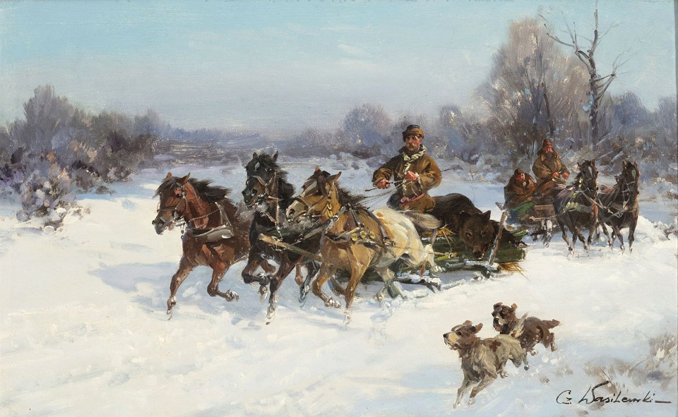 Lot 164. Jerzy Kossak (Polish 1886-1955), “Zimowy Patrol“, oil on canvas, signed and dated “1939” lower left and titled verso. 27 1/4″ x 38 1/2″. Replaced stretchers. Disassembled frame comes with the painting measuring square: 39″ x 49 1/2″. Very good condition. Polish letter of Authentication. Estimate $2,500 – 4,000. San Rafael Auction Gallery. 06/24/23. Sold $4,750