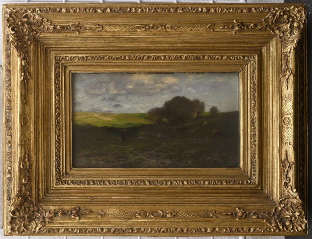 Lot 538. KOCHANOWSKI, ROMAN 1857 Krakau – 1945 Freising. Landschaft mit Kühen und Hirtin. Öl auf Holz. R. u. signiert. Min. beschädigt. 12,7 x 22,2 cm. Rahmen. Estimate 1,000 euro. Scheublein Art. 03/30/23. Sold 1,400 euro