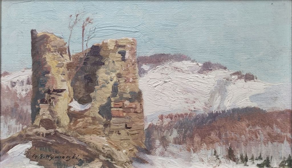 Lot 1203. Wywiorski, Michael Gorstkin (1861 Warsaw – 1926 Berlin). “Ruin in the Snow“, snowy, hilly landscape with dilapidated building in the foreground, oil on cardboard, signed on the lower left, 18x30cm, 22x34cm with frame. Opening 300 euro. Auktionshaus am See. 07/30/23. Sold 600 euro