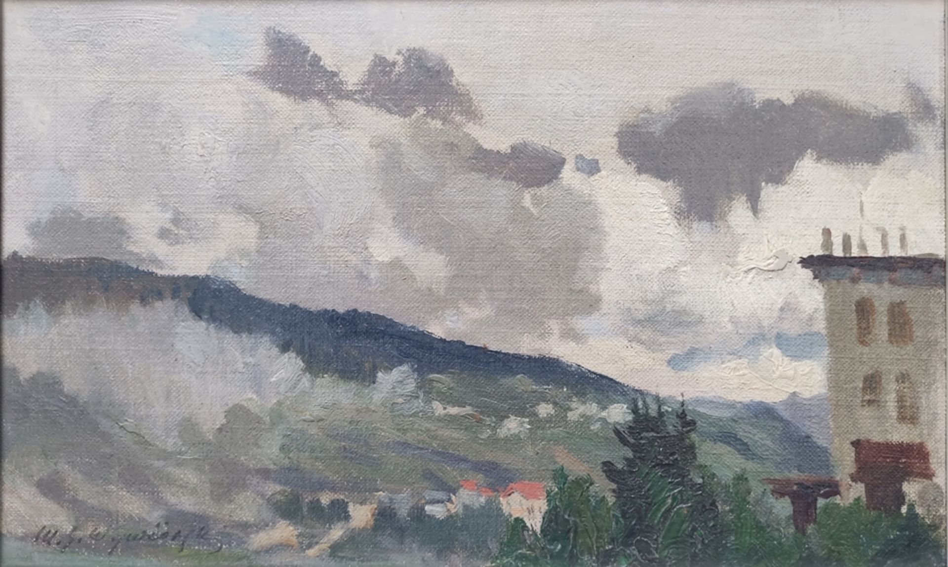 Lot 1204. Wywiorski, Michael Gorstkin (1861 Warsaw – 1926 Berlin). “City in the Valley“, landscape view of wooded hills, some roofs visible, single building in the foreground at the edge of the picture, oil on cardboard, signed on the lower left, 18x30cm, 22,5×33,5cm with frame. Opening 300 euro. Auktionshaus am See. 07/30/23. Sold 500 euro