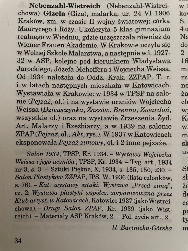Dorobek artystyczny Gizeli Nabenzahl-Wistreich jest praktycznie nieznany. Nawet Słownik Artystów Polskich (SAP) opublikował biografię artystki w kilku zdaniach i zaledwie na ćwierci strony, wspominając jedynie o kilku jej pracach z lub po 1934 roku. Na aukcji w Yair mamy jej olej, z 1931 roku, czyli 25-cio letniej artystki. Nie spodziewałem się, że SAP o śmierci malarki będzie informował stosując eufemizm (‘zmarła w czasie II wojny światowej’). Gizela Nabenzahl-Wistreich została zamordowana przez Niemców.