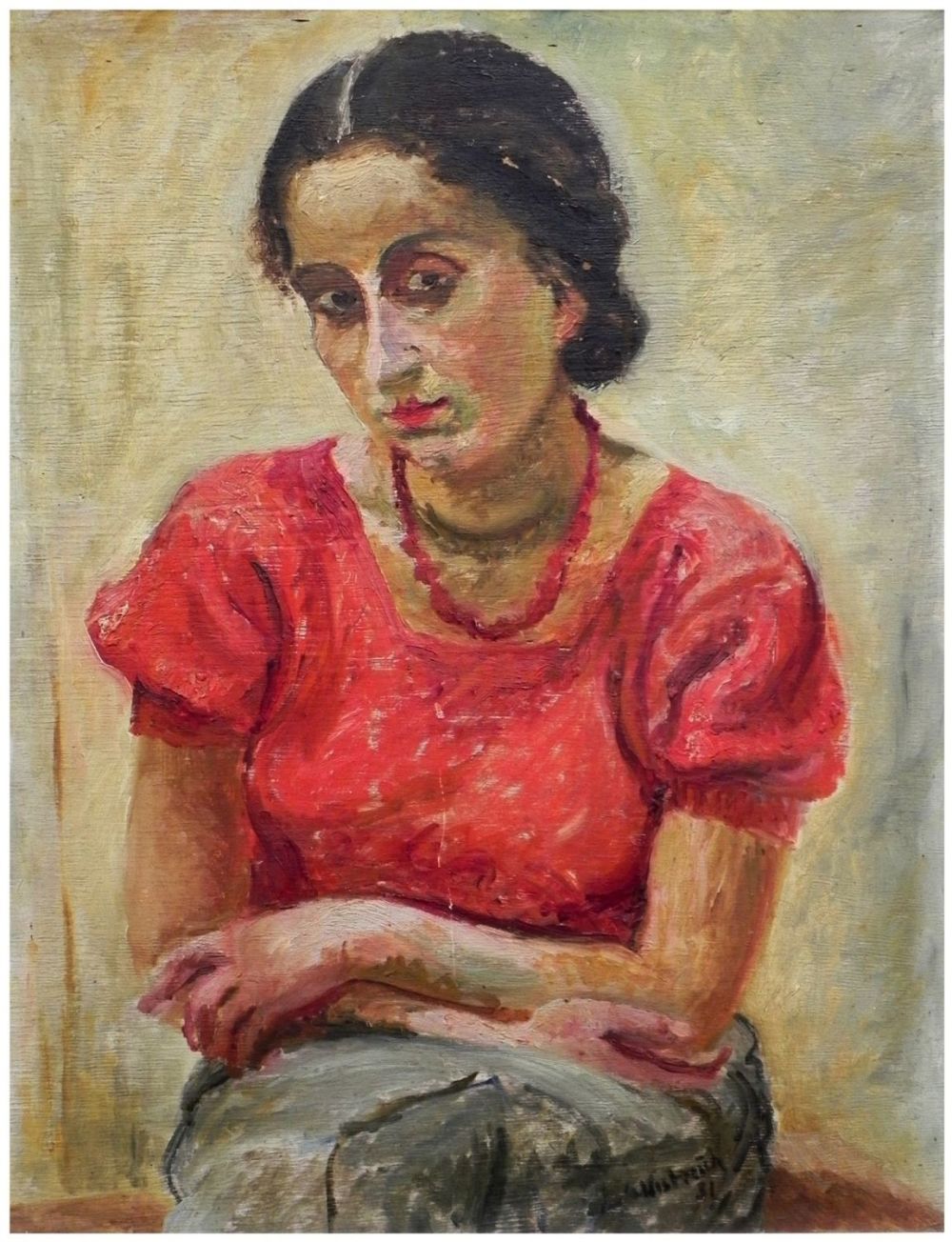 Lot 79. Gizela Nebenzahl-Wistreich (Polish, 1906 in Kraków – 1942, murdered in the Holocaust). Seated woman in red blouse, 1931. Oil on wood, 67 x 53 cm, Signed and dated. Opening $1,800. Yair Gallery. 07/23/23
