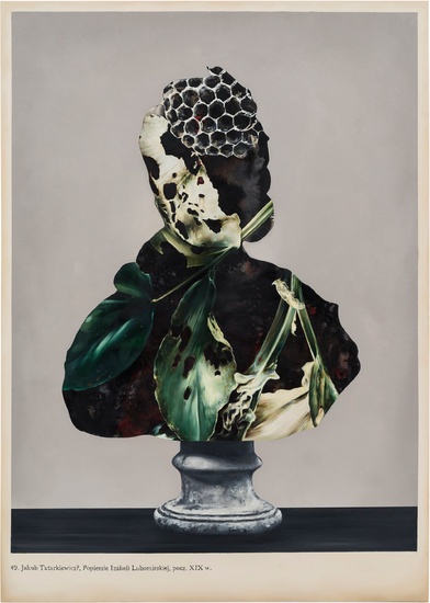 “In these paintings, by covering or modifying a portrait, I want to disrupt the known order and shatter the uniform and conservative image of female beauty. Through a metamorphosis of classical paintings, I change their interpretation and provoke new, alternative associations… By interweaving elements relating to the canon and tradition with elements derived from nature and the senses, I want to release the expression, emotion, and vitality previously hidden by convention.”