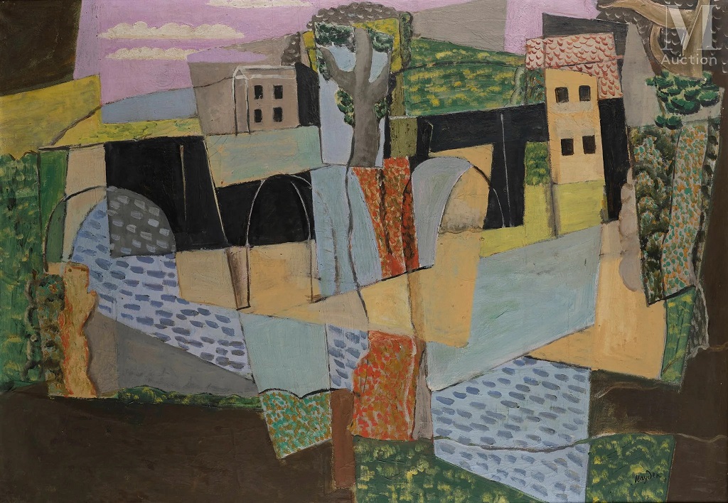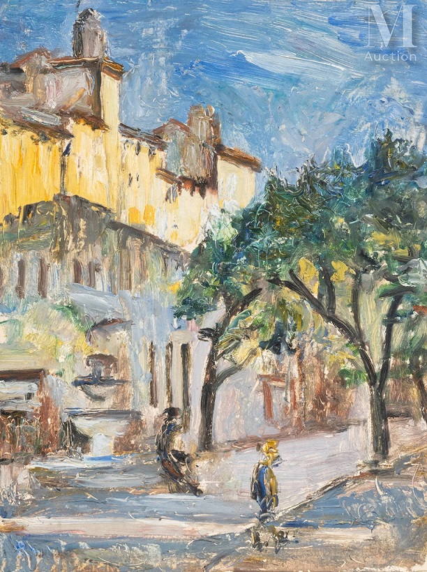 Lot 124. SLOMSZYNSKA Olga dite Olga SLOM (Suisse 1881- France 1941). Promeneurs dans un village du Midi. Huile sur carton 33 x 25,5 cm. Estimate 300 – 400 euro. 10/24/23. Not sold
